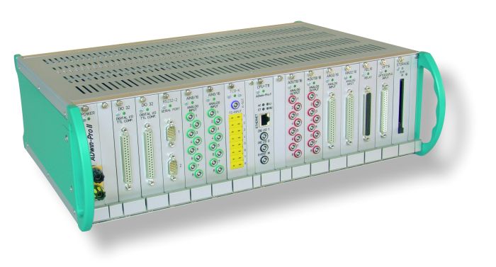 ADwin data acquisition systems feature tightly-coupled analog and digital inputs along with counters to provide users’ applications with extremely low-latency operation. The ADwin-Pro II Series utilizes a modular form factor with plug-in modules to allow up to 480 analog or digital inputs in a single chassis, along with a high-performance 300 MHz DSP processor and Ethernet communications interface. Users also have a variety of other I/O options including CANbus, SSI, Profibus/Fieldbus, RS-232/485, and signal conditioner modules.